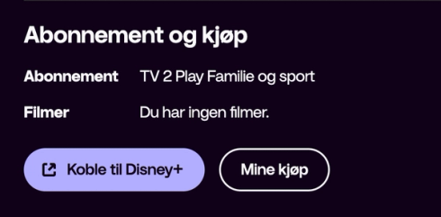 Før du begynner å se må du koble til tilgangen din. Det er to måter å gjøre dette på. Du kan koble til Disney+ ved å klikke på Koble til Disney+ på innhold du vil se eller ved å gå inn på konto-siden til TV 2 Play.